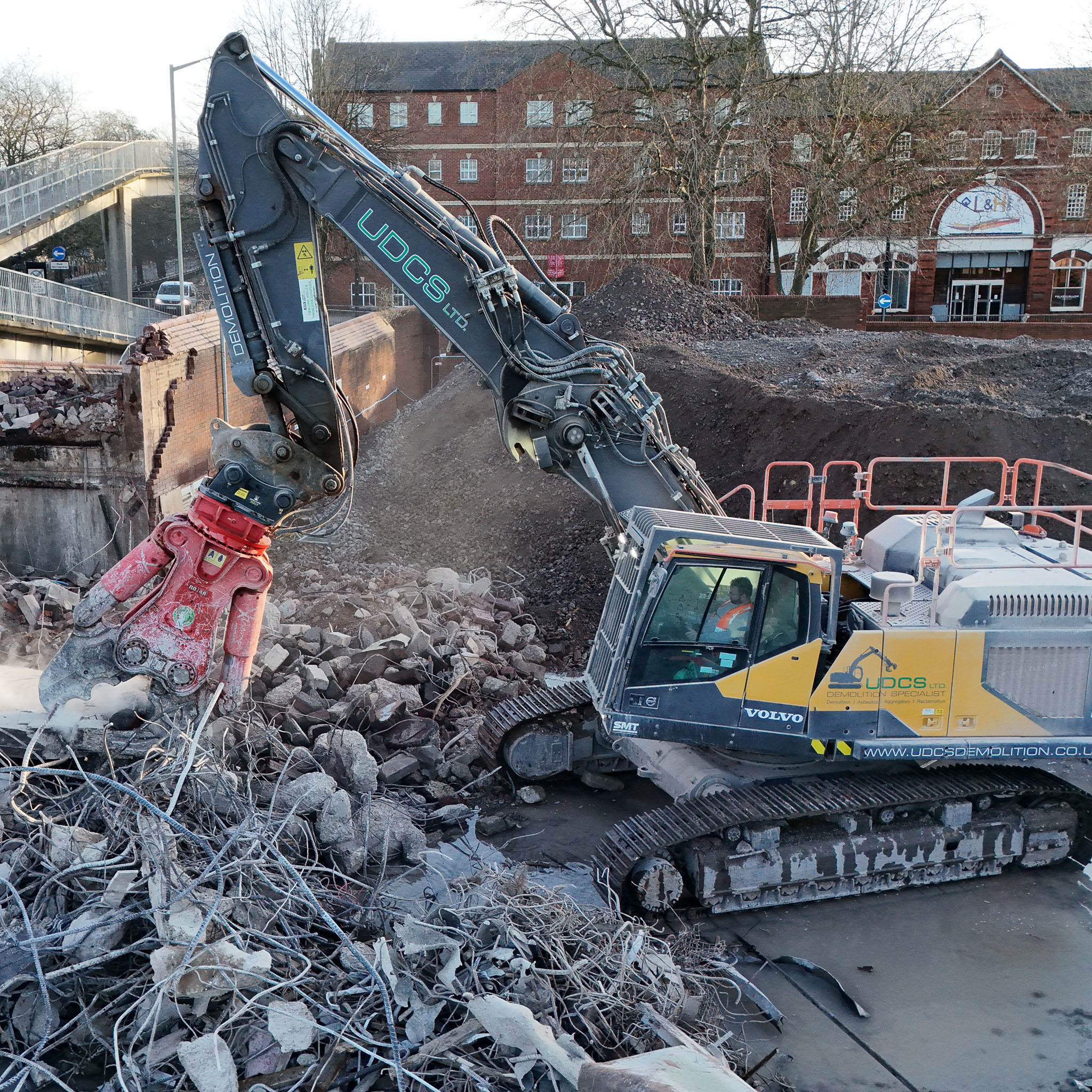 Whilst a large proportion of the building was open shopping space, the structure was constructed with a variety of methods around its brick façade. The modern fleet of Volvo demolition machines operated by UDCS was ideally suited to the demolition works. With a high-reach EC380E taking care of the bulk of the structure, the secondary processing and material handling was undertaken by smaller Volvo machines and a new JCB 370X, which handled the crushing operation and loading out of processed material.