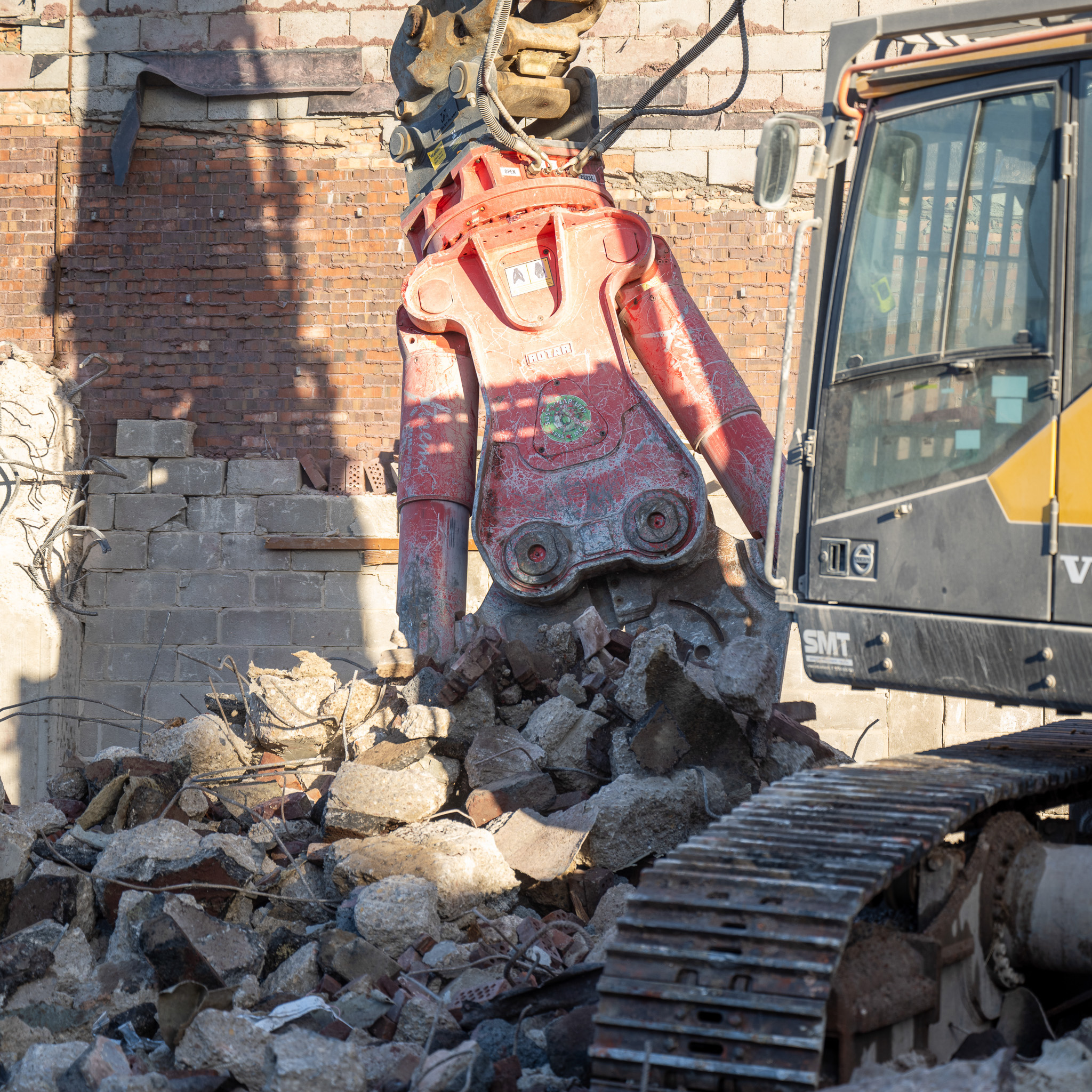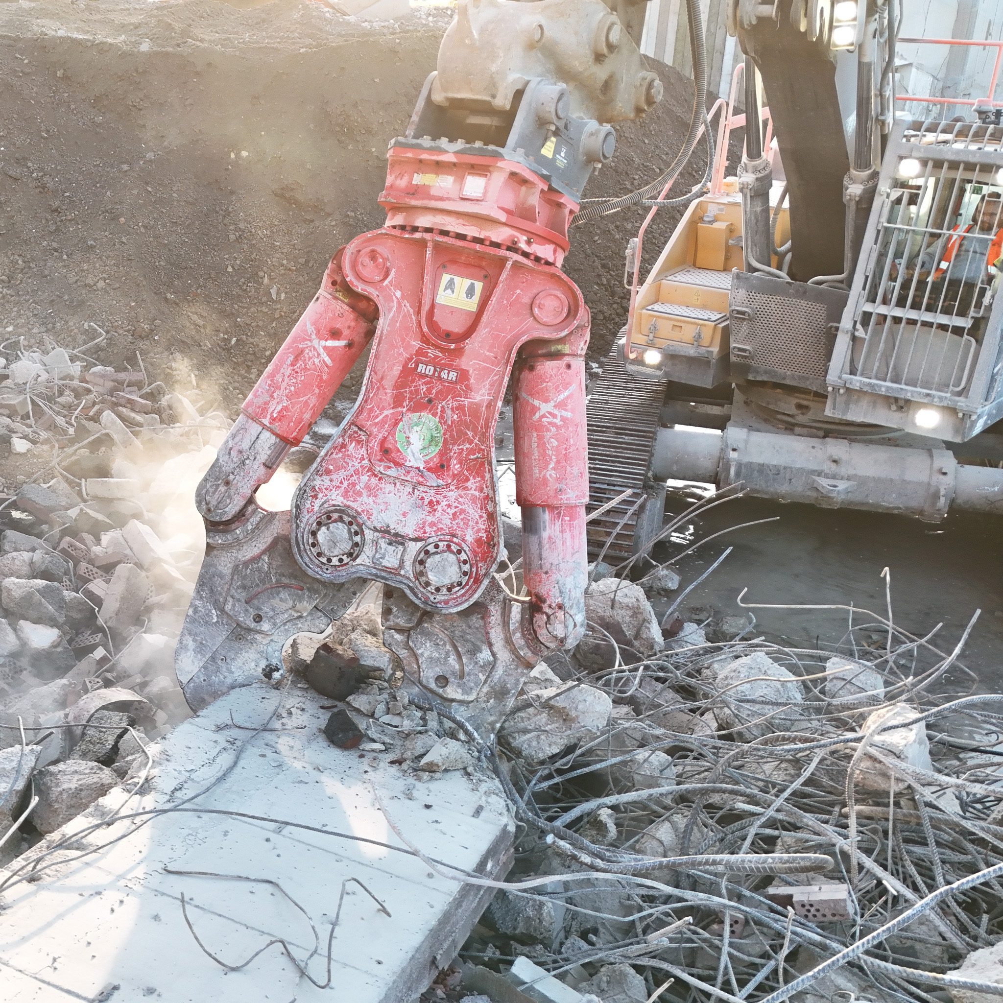 Once on site and fitted to the 40t excavator, the addition of the RCC45 made an instant impact. The RCC45 is currently the largest of the four-model RCC range and comes with an operating weight of just over 4.7 tonnes. The dedicated cracker uses a pair of cast jaws with a huge maximum opening width of 1444mm. The scalloped edges to the jaws transfer the huge pressure from their respective hydraulic cylinders to crack even the toughest of material. Pushing out over 220 tonnes of pressure on the inner points will open up almost any concrete around, and when the tool finds the rebar inside, the knives in the attachment’s throat kick out over 1400 tonnes of closing force, easily cutting through the most stubborn of rebar. The RCC range, like the rest of the Rotar tools, offers users an easily removable jaw set which allows the site teams to quickly change cutting edges when they become worn to ensure the tool’s performance is kept high.