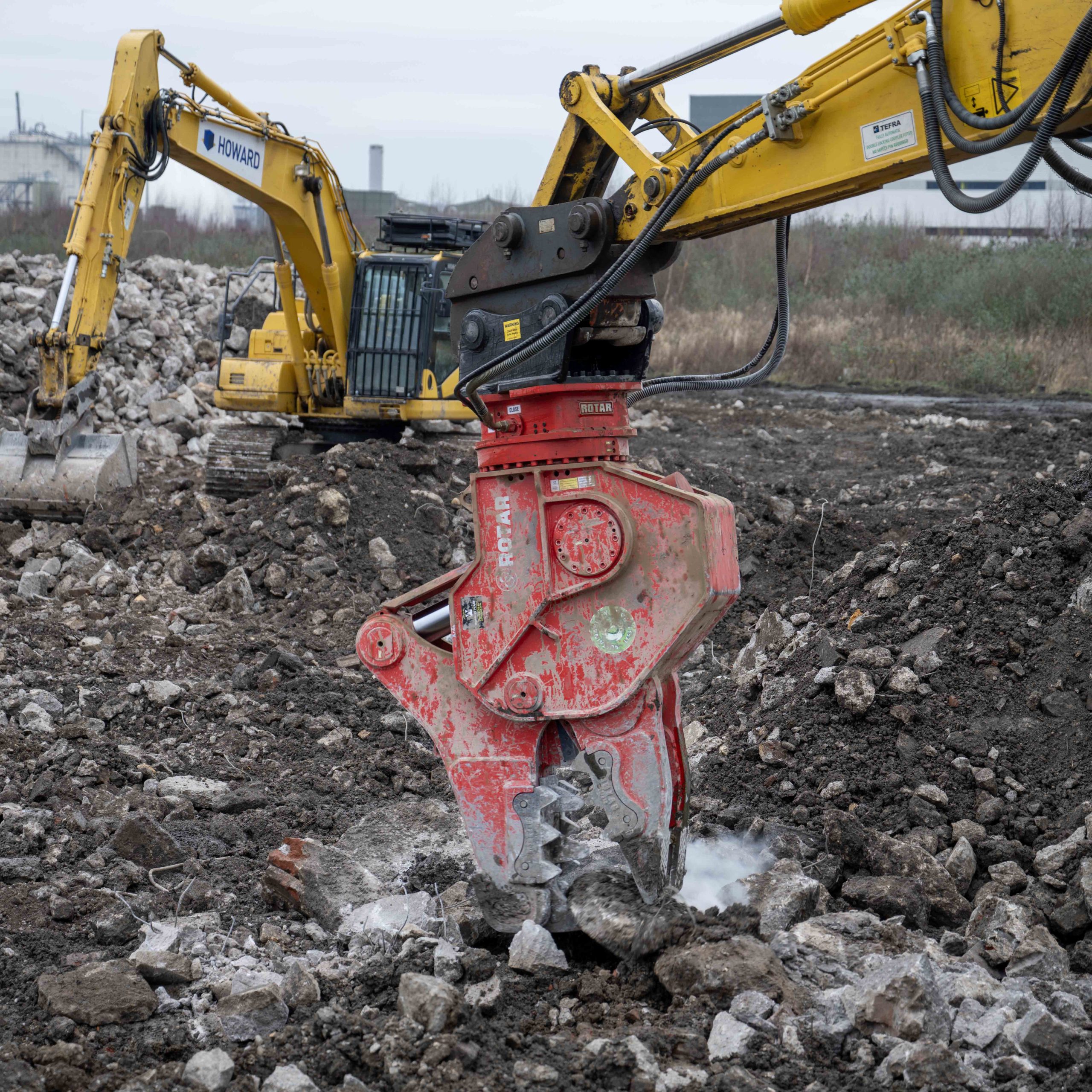 Worsley Plant are the sole UK dealers for the Dutch designed and manufactured range of Rotar demolition attachments. The comprehensive range covers selector grabs, dedicated crackers, processors and shears along with a combination range which offers the best of the cracker and processor range rolled into one unit. Ross’s initial visit to site identified the concrete as being material which could be adequately handled by the company’s range of RDP processors. Following the initial trial of the RDP machines, Howard Civil Engineering placed an order for an RDP25 and RDP32 to work on their Komatsu PC210 and PC360 excavators respectively. Along with the two Rotar RDP models which had suitably impressed, Craig also ordered a Dynaset magnet to assist in the removal of rebar from the processed concrete. “We will have a large volume of rebar on the job and ensuring the full recovery of this material will allow us to recover a large proportion of the investment we have made in the new kit.” He commented. The final addition from Worsley Plant was an attachment from the company’s hire fleet. “We suggested to Craig that a steel shear would benefit them in processing rebar and other steel beams they have found on this job.” Ross explained. “Whilst the cost of investing in a new Rotar shear was prohibitive just for the small amount of time it will be used on the job, we were able to offer a quality refurbished VTN MT20 from our fleet.”