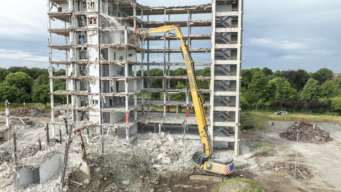 Whilst Jake’s fleet of modern demolition equipment and attachments was capable of taking down some of the smaller buildings on site, the main office building standing at over 50m in height gave the company something to think about. ‘We have several high reach machines in the fleet which can undertake the bulk of our demolition operations.’ Jake commented. ‘But with a height of over 50m, the building meant we had to look at other alternatives for demolition. With long lead times for new kit and the client’s needs for the remaining structures to be demolished, we made the choice to source a second-hand machine, eventually settling on a good quality CAT 349E with a Kocurek 37m telescopic arm. This purchase gave us the ability to cost effectively enter a new market for us and meant that we were able to remove The Giro from the Bootle skyline quickly and safely.’