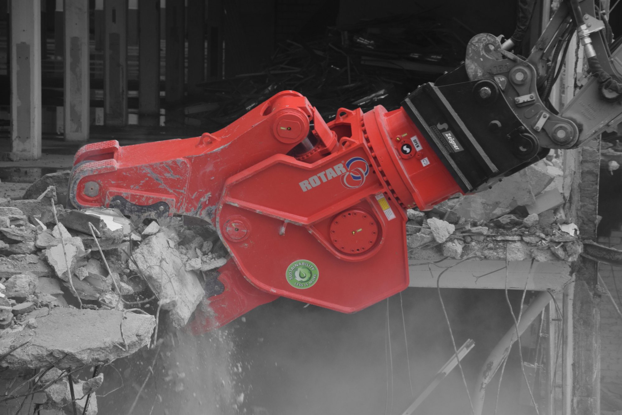 The Rotar RDP 20 S is a compact yet powerful rotating pulveriser for excavators in the 15–25 tonne class. It’s designed to break reinforced concrete structures with ease, offering excellent cutting power combined with a fast jaw cycle. The rotating upper head and a heavy-duty slewing ring provide full 360° rotation, while the speed-valve lets you switch from speed mode to high crushing power as needed.